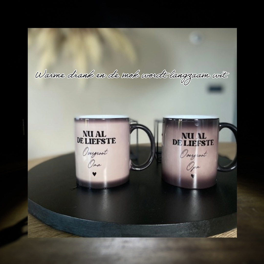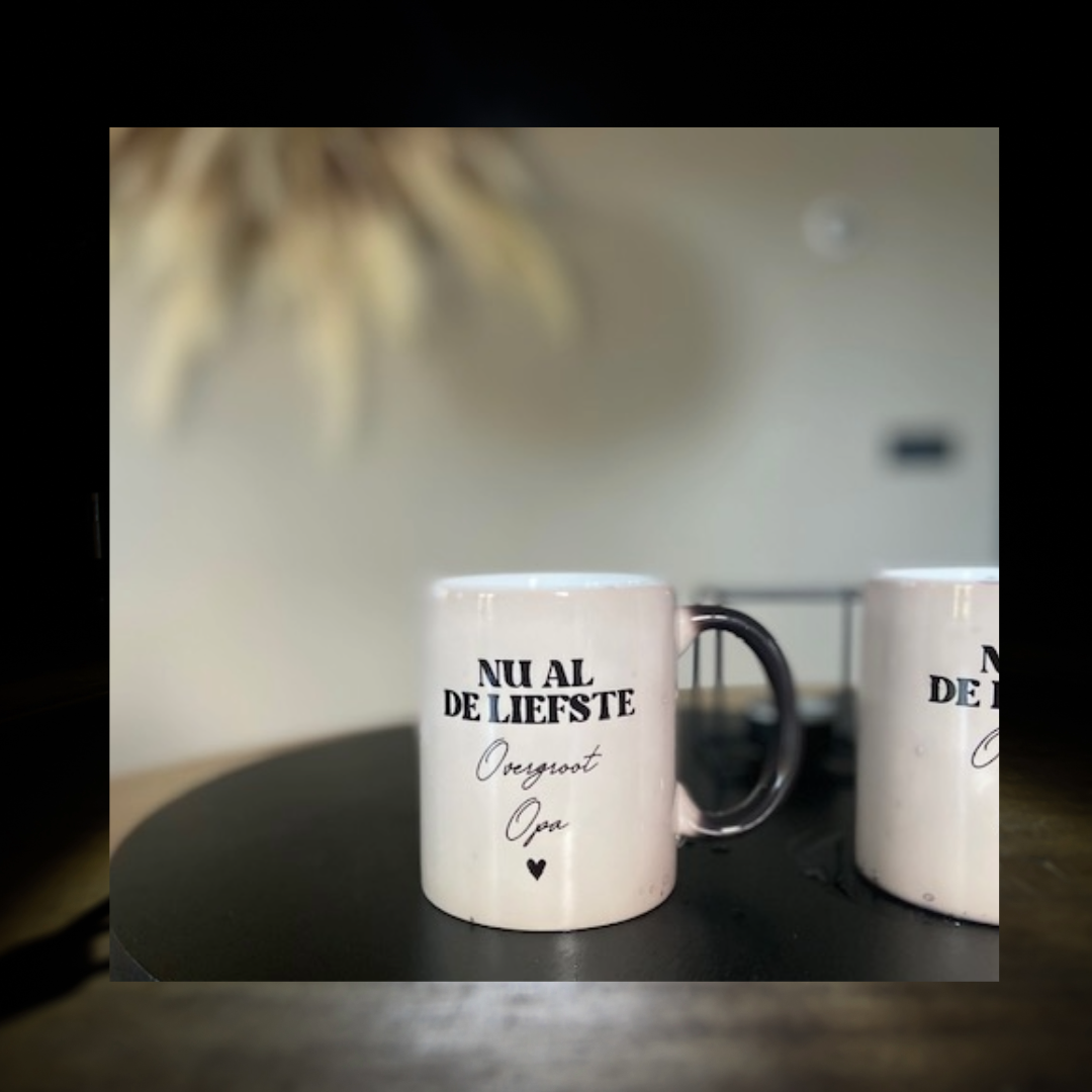 Op het eerste gezicht lijkt het een gewone zwarte mok, maar zodra je er warme koffie, thee of chocolademelk in schenkt, gebeurt er iets magisch… De verborgen tekst “Nu al de liefste overgroot Oma” of “Nu al de liefste overgroot Opa” verschijnt langzaam op de beker! Een prachtig, ontroerend moment dat niemand ooit vergeet.