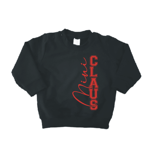 Mama Claus & Mini Claus kerst sweaters – matching set voor moeder en kind Zwarte sweaters met kleurrijke bedrukking Zachte fleece binnenkant – warm en comfortabel Verkrijgbaar in verschillende maten voor jong en oud Tekstkleuren naar keuze – rood, wit, goud, zilver en meer Uniek ontwerp van Livingstickers Zaandam Perfect als cadeau of voor een gezellige kerstfoto