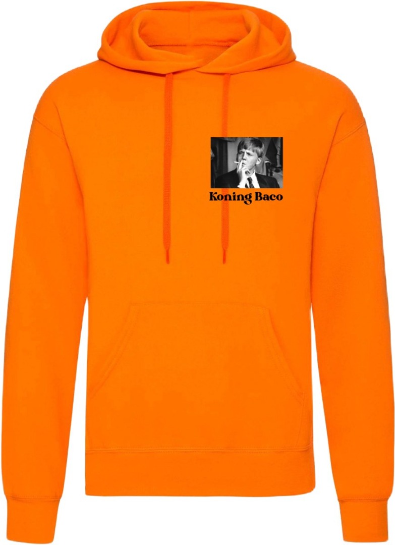 Oranje hoodie Koning Baco hoodies met leuke teksten. Zacht, warm en verkrijgbaar in maten S t/m XXXL. Perfect voor Koningsdag. Shop bij Livingstickers Zaandam.