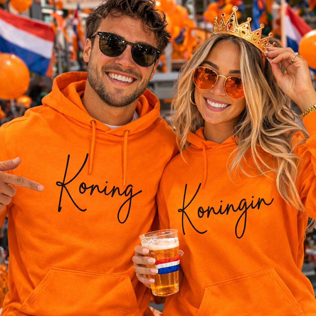 Oranje hoodie set Koning en Koningin Zacht, warm en verkrijgbaar in maten S t/m XXXL. Perfect voor Koningsdag. Shop bij Livingstickers Zaandam.