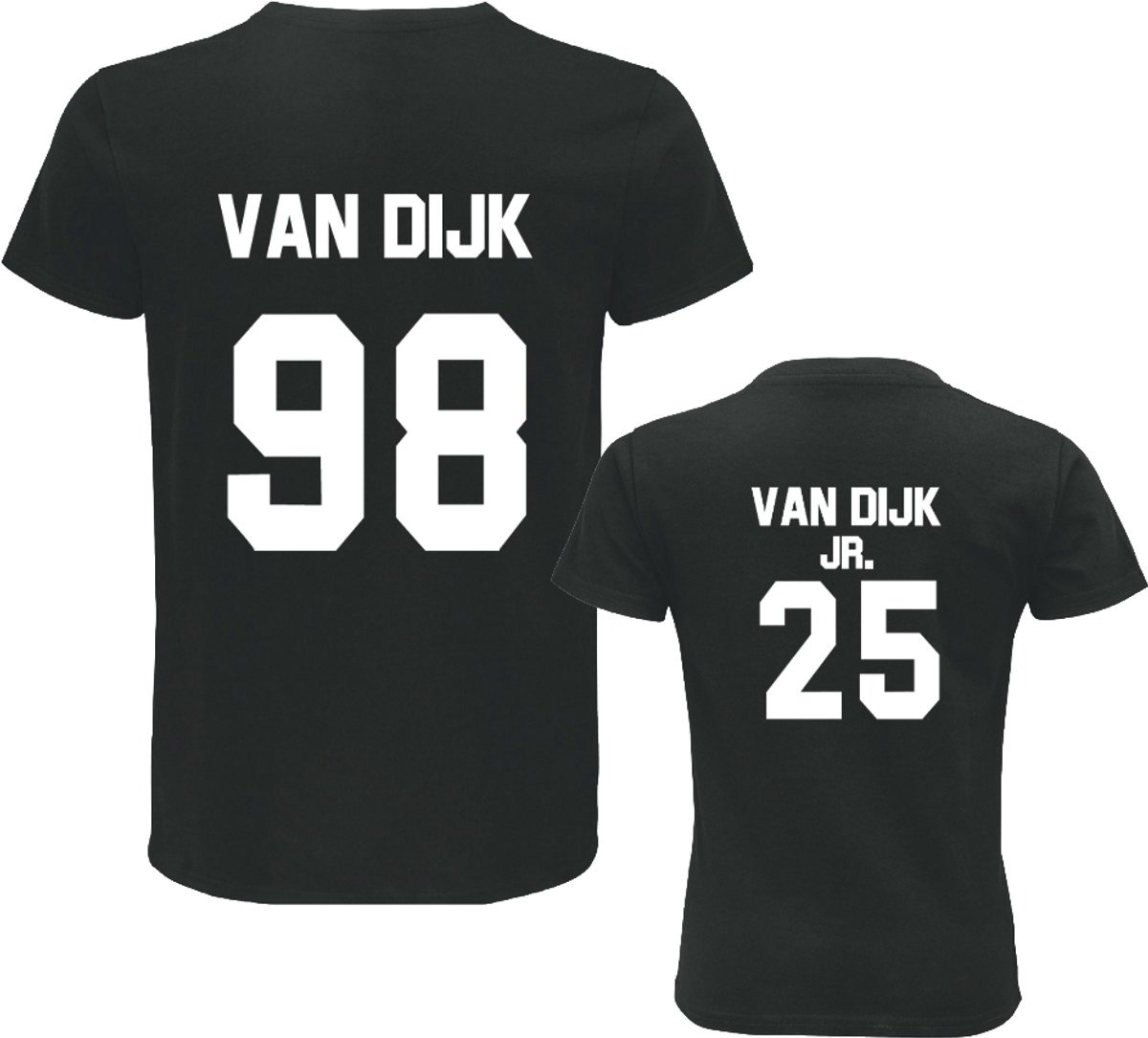De shirts worden volledig naar wens bedrukt met jullie achternaam en geboortejaar, waardoor elk setje uniek is. De sportieve uitstraling met rugnummer geeft het geheel een stoere en moderne look, ideaal voor vaders en kinderen die samen een sterk team vormen. Dankzij de hoogwaardige printtechniek blijven de kleuren lang mooi, zelfs na veelvuldig wassen.