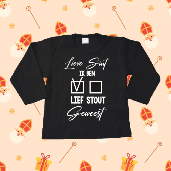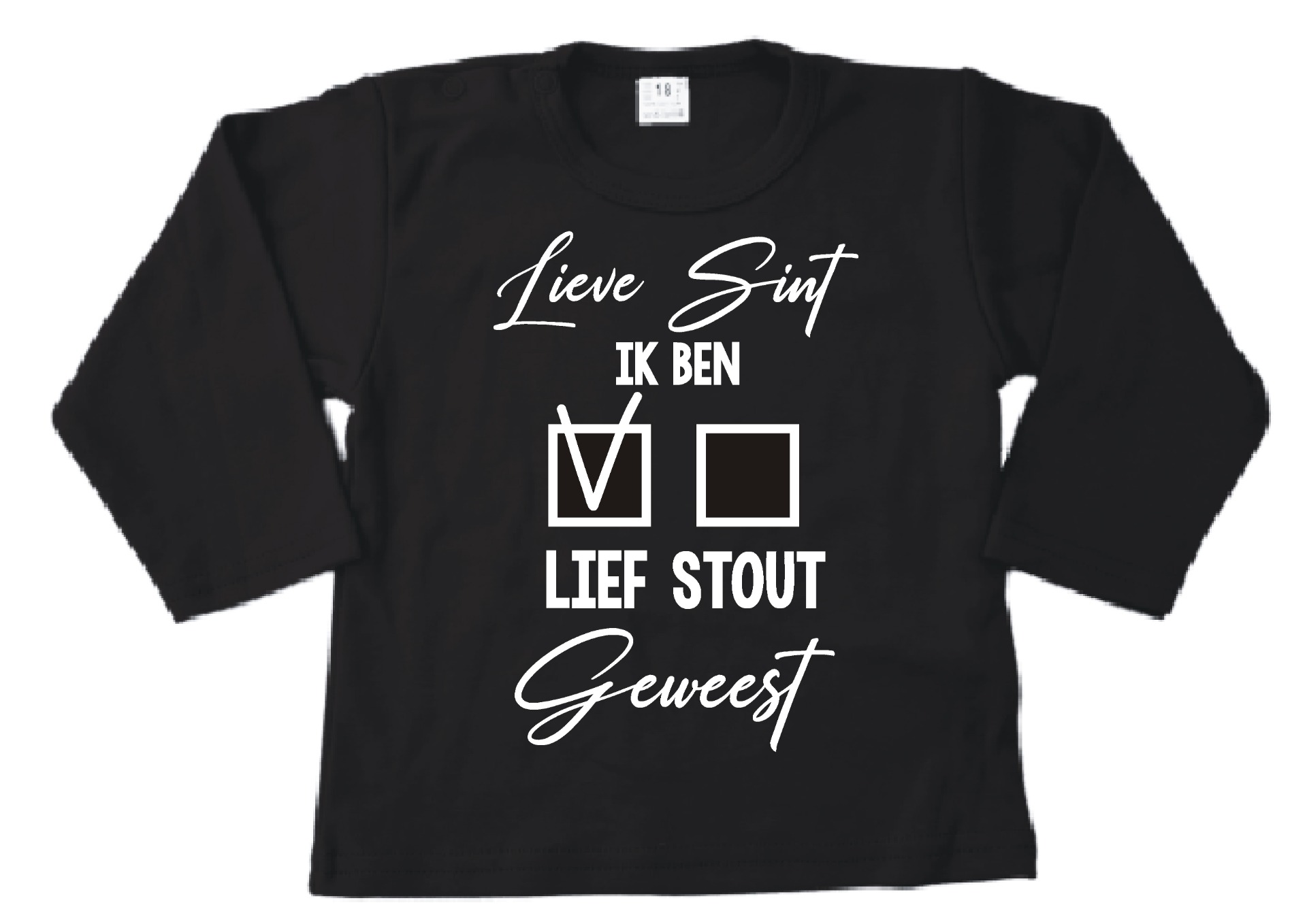 Op zoek naar een origineel Sinterklaascadeau? Dan is dit Sinterklaas shirtje met lange mouw in zwart met de tekst “Ik ben lief geweest” een schot in de roos! Leuk om te geven aan kinderen, neefjes, nichtjes of zelfs aan volwassenen die nog dol zijn op het Sinterklaasfeest.
