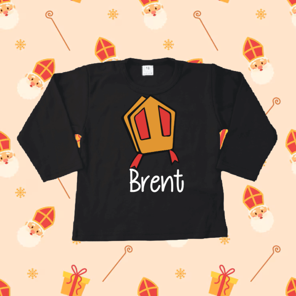 Op zoek naar een origineel Sinterklaascadeau? Dan is dit Sinterklaas shirtje met lange mouw in zwart met de tekst “Sinterklaas shirtje met mijter en naam